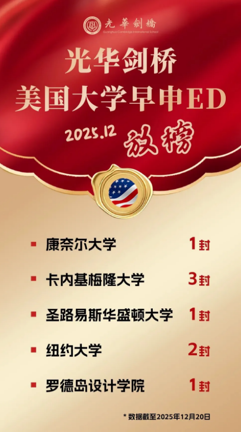 在26fall美本早申ED中,截止2025年12月20日,光剑学子共收获藤校康奈尔1枚,卡内基梅隆3枚、纽大2枚、圣路易斯华盛顿1枚、罗德岛设计1枚。
