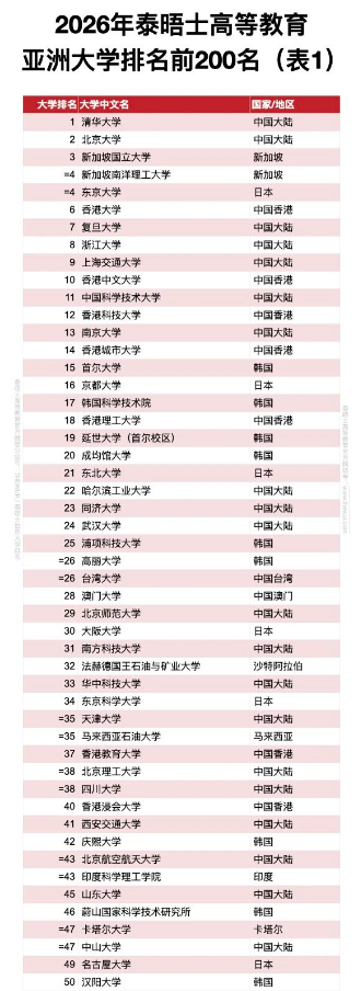 摘要:近日,泰晤士高等教育(THE)正式发布2026年亚洲大学排名!这是全球唯 一以大学核心使命——教学、研究、知识转移与国际视野为维度,衡量研究型大学表现的重要榜单。今年共有来自36个国家与地区的929所高校上榜,数量再创新高。排名依据18项精心校准的绩效指标,并针对亚洲大学特质进行了权重调整,涵盖教学环境、研究数量与声誉、研究质量、国际展望及产业收入五大领域。话不多说,一起来看看你的梦校排在第几位!