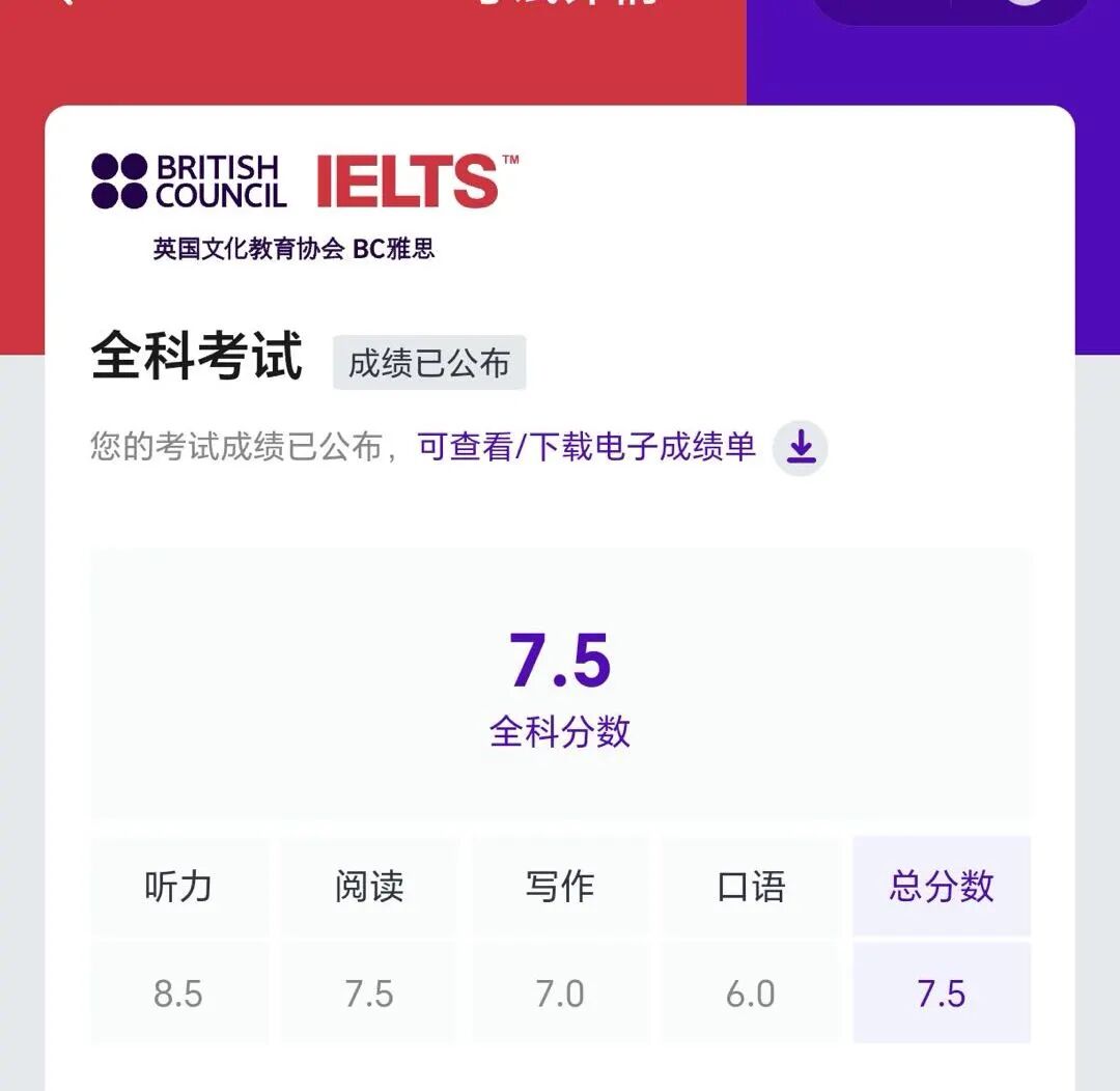 【雅思成绩】总分7.5