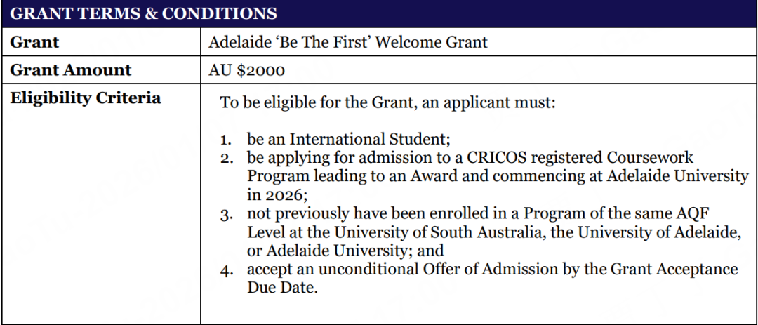 同时,为迎接2026年首届国际学生的到来,阿德莱德大学正式推出首届迎新助学金(“Be The First” Welcome Grant),奖学金金额2000澳元(约人民币10000元),无需额外申请,无GPA要求!