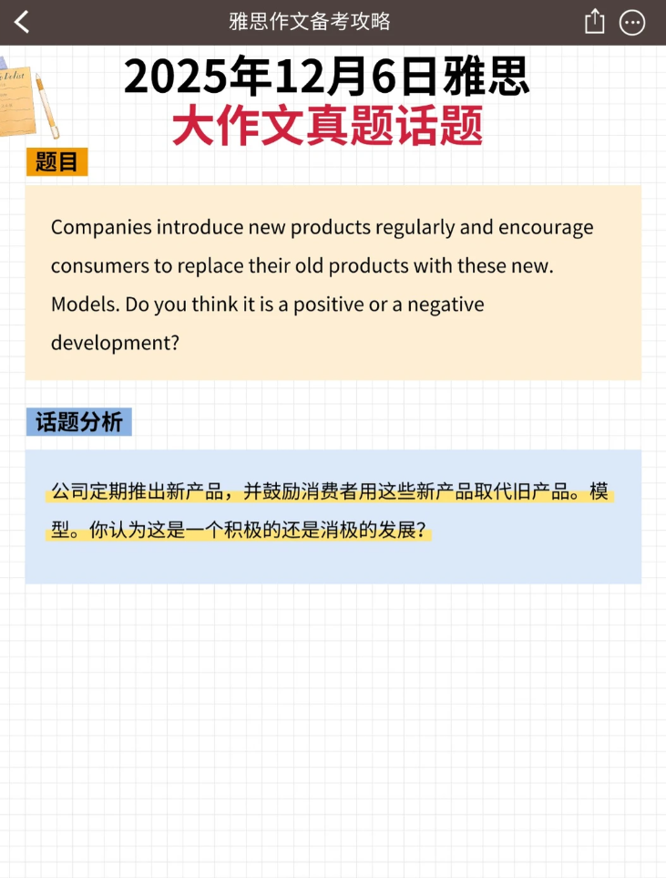 摘要:2025年12月6日的雅思大作文再次聚焦于当代消费社会的核心议题:企业不断推出新产品并鼓励更新换代,这一趋势究竟利大于弊,还是弊大于利?本题不仅考察考生对经济与商业现象的理解,更要求辩证分析其对消费者、企业乃至环境产生的多维影响。本文将深入剖析这一高频话题,提供清晰的论证框架与高分表达,助您在下笔时做到观点明确、论述有力。
