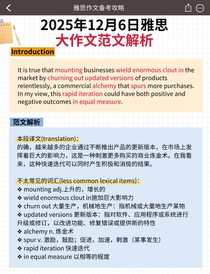 2025年12月6日的雅思大作文再次聚焦于当代消费社会的核心议题:企业不断推出新产品并鼓励更新换代,这一趋势究竟利大于弊,还是弊大于利?本题不仅考察考生对经济与商业现象的理解,更要求辩证分析其对消费者、企业乃至环境产生的多维影响。本文将深入剖析这一高频话题,提供清晰的论证框架与高分表达,助您在下笔时做到观点明确、论述有力。
