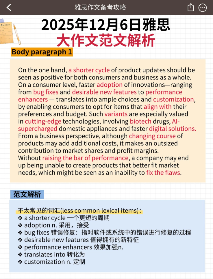 综上所述,企业推动产品快速迭代是一把双刃剑,它在驱动创新、改善体验的同时,也带来了过度消费与环境压力等深层问题。在应对此类利弊分析题型时,关键在于展现平衡的视角与具体的论证层次。掌握核心词汇与灵活运用论证框架,将帮助您在考场上有效组织观点,精 准表达。持续关注每场考后解析,积累话题语料,是稳步提升写作实力的可靠路径。