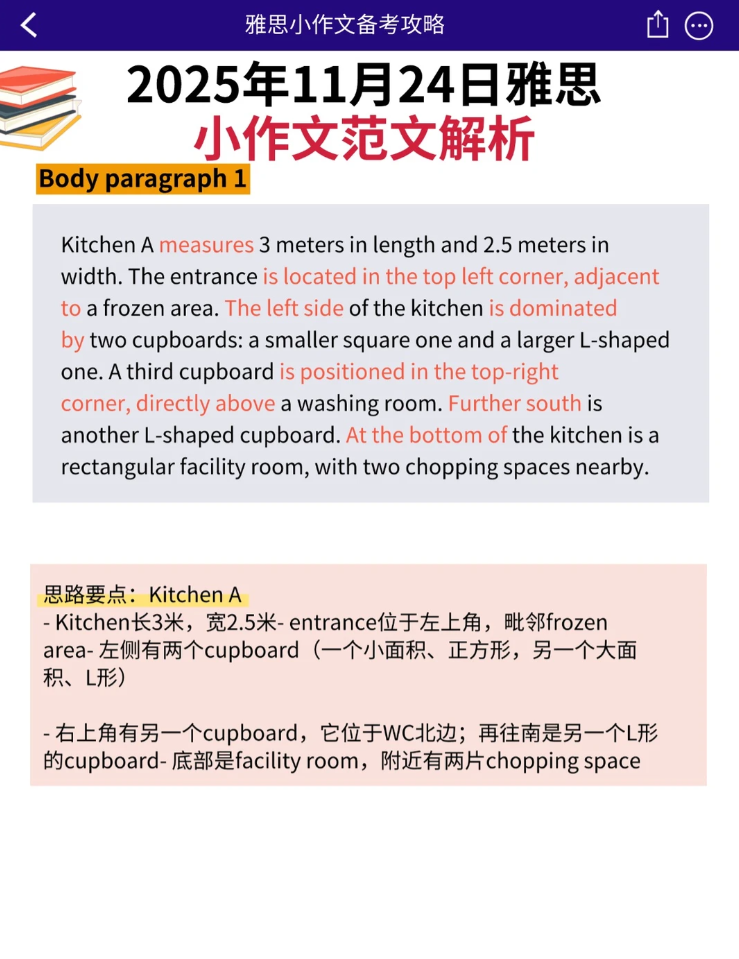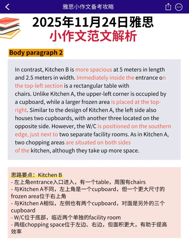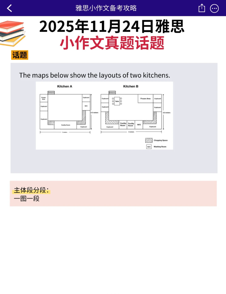 摘要:2025年11月24日的雅思小作文考察了经典的“地图对比”题型,要求考生分析两幅不同厨房平面图的布局异同。这类题目不仅考验空间描述与方位表达的准确性,更需在细节比较中清晰呈现核心差异与整体格局。为此,精 准的词汇选择与严谨的逻辑顺序是获取高分的关键。本篇范文解析将带你梳理“地图题”的核心写作框架,并提供实用的高分表达,助你从容应对此类题型。