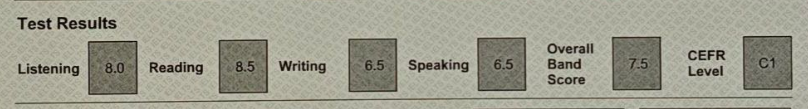雅思总分:7.5分 听力8.0 阅读8.5 写作6.5 口语6.5