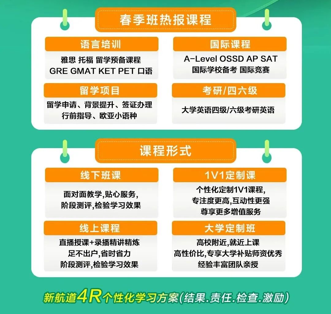 新航道春季班深耕外语教学、国际课程与留学服务,课程体系全覆盖,一站式满足不同阶段、不同目标的学习需求,你想要的课程,这里全都有!