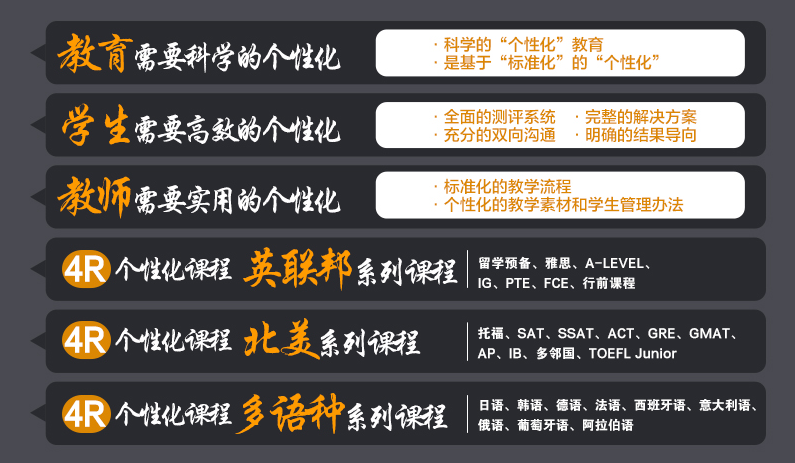 雅思、托福、GRE、GMAT、SAT/ACT,从基础夯实到高分冲刺,分阶授课直击考点