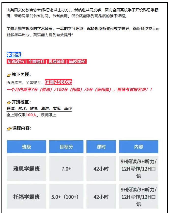 与其同时备战四六级、考研、雅思多门考试,不如一门雅思/托福通通搞定。新航道学霸班,线下面授仅需2980元,一个月内首考达标的学员还能报销考试报名费。更棒的是,上课就在校内,与同校校友互为“学习搭子”,学习、干饭、放松都不耽误。名额有限,全上海仅限100人,新学期,从一次聪明的选择开始。