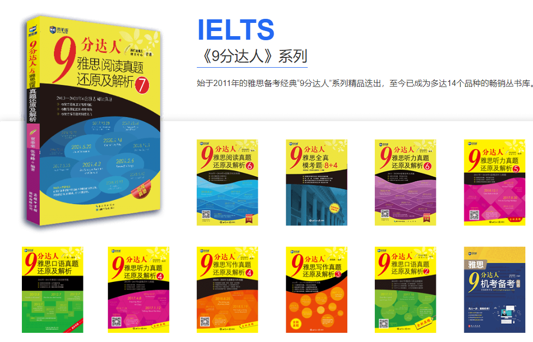 始于2011年的新航道雅思备考经典“9分达人”系列新品迭出,至今已成为多达19个品种的丛书库。