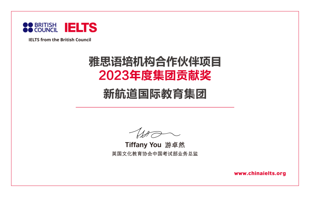 发展二十余年来,新航道始终坚持学术品质,在课程与产品体系打造上精益求精。2024年,英国文化教育协会公布2023年度雅思官方合作伙伴评级,新航道共获15项奖项,其分校更斩获3个白金级伙伴荣誉称号。因在2023年雅思考生培训中表现卓越,雅思官方还特别颁发“集团贡献奖”,充分体现了新航道在雅思培训领域的专业实力与行业影响力。