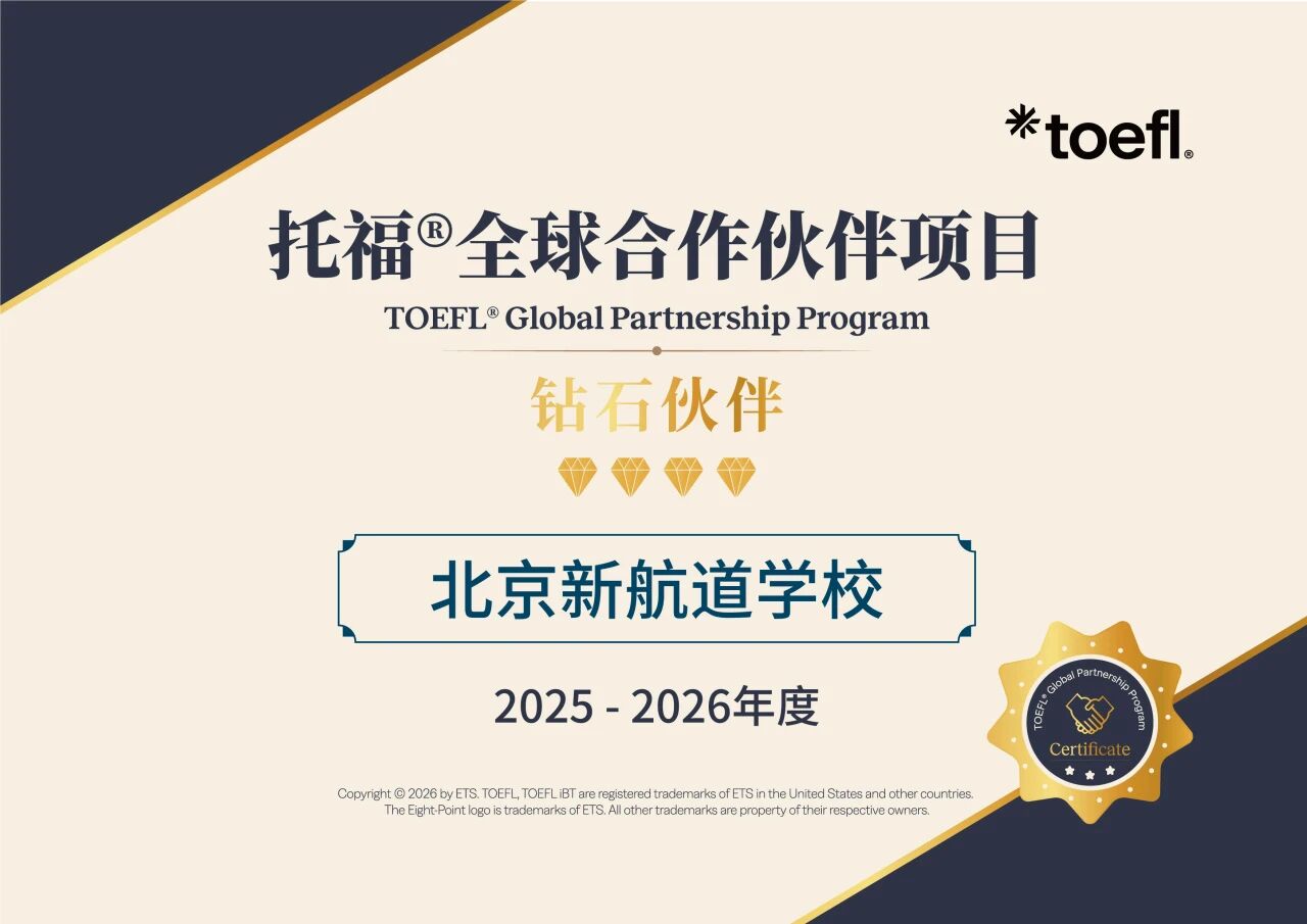 新航道作为托福官方长期合作伙伴,连续六年获得最 高荣誉(2020-2024年“托福联盟项目三星级成员”,2025年“托福全球合作伙伴项目钻石伙伴”),不仅体现了ETS官方对新航道的高度认可,也彰显了新航道在2025年托福培训中的卓越贡献与专业实力。