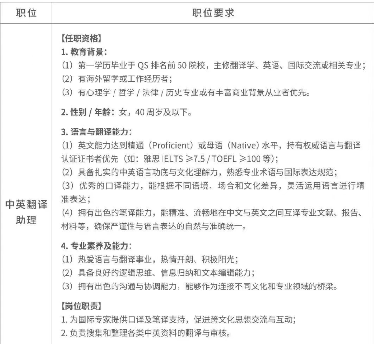 · 第 一学历需毕业于 QS 排名前50的院校,专业方向为翻译学、英语、国际交流或相关专业;
