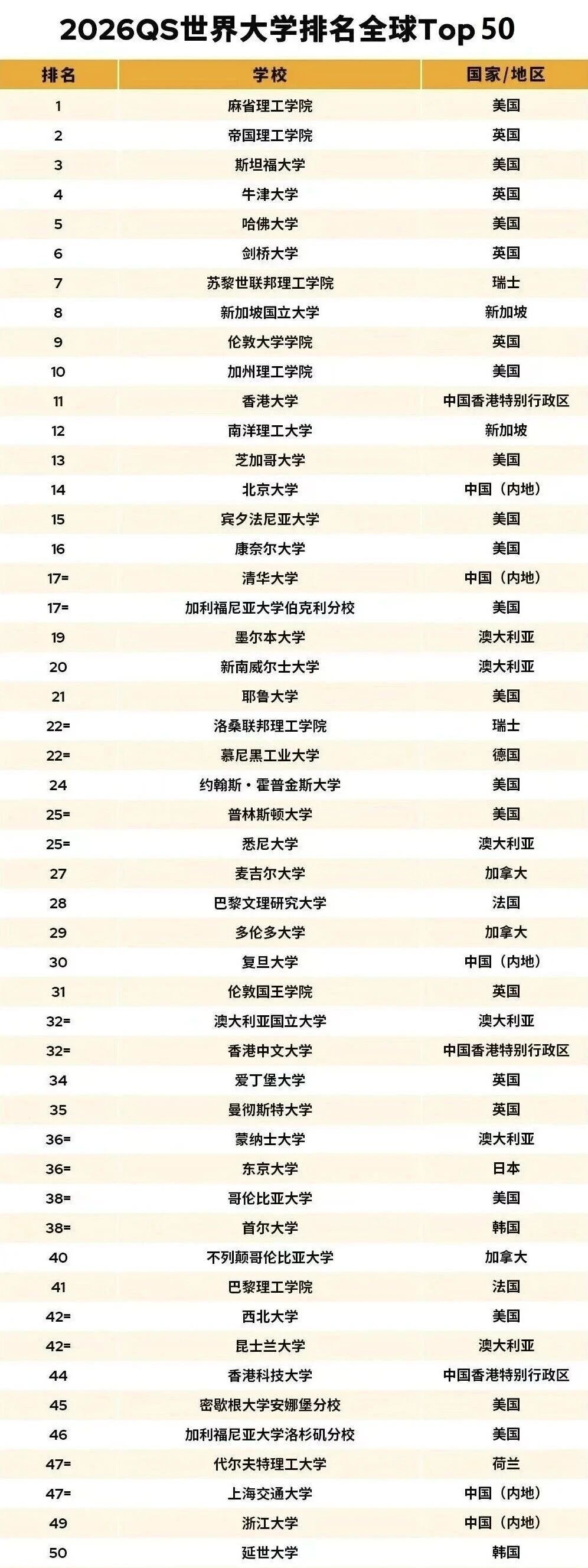 从招聘条件来看,这次岗位对留学生的友好度拉满。QS 前50的院校名单里,中国内地能进入这一梯队的只有清华、北大、复旦、上交、浙大五所学校。再叠加“需要具备海外经历”这一条,整体指向已经非常明确:招聘目标就是有海外学习背景的同学们。
