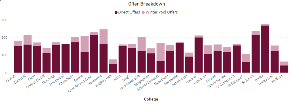 根据剑桥官方数据,在典型年份,约3,500名申请者获得原申请学院的录取,另有约1,000名申请者通过Pool机制获得其他学院的录取。