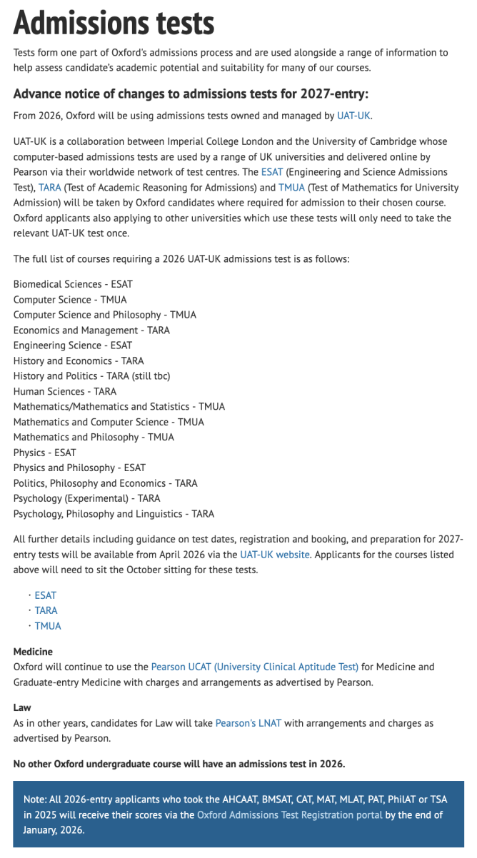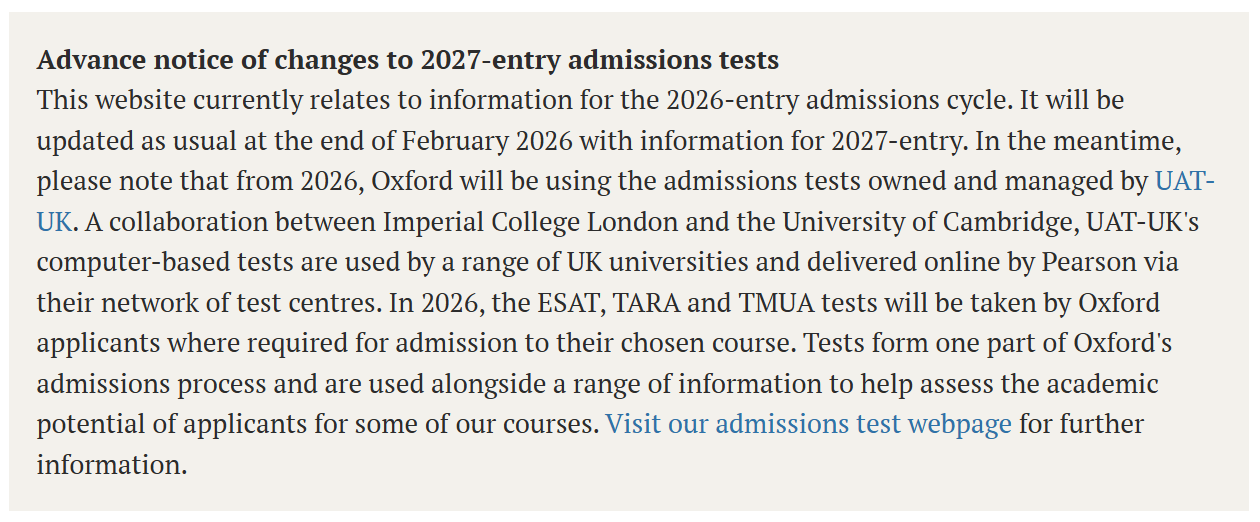 自2026年起,牛津大学将全面采用由剑桥大学和帝国理工学院联合运营的UAT-UK入学考试体系,MAT、PAT、TSA等传统笔试正式退出历史舞台。