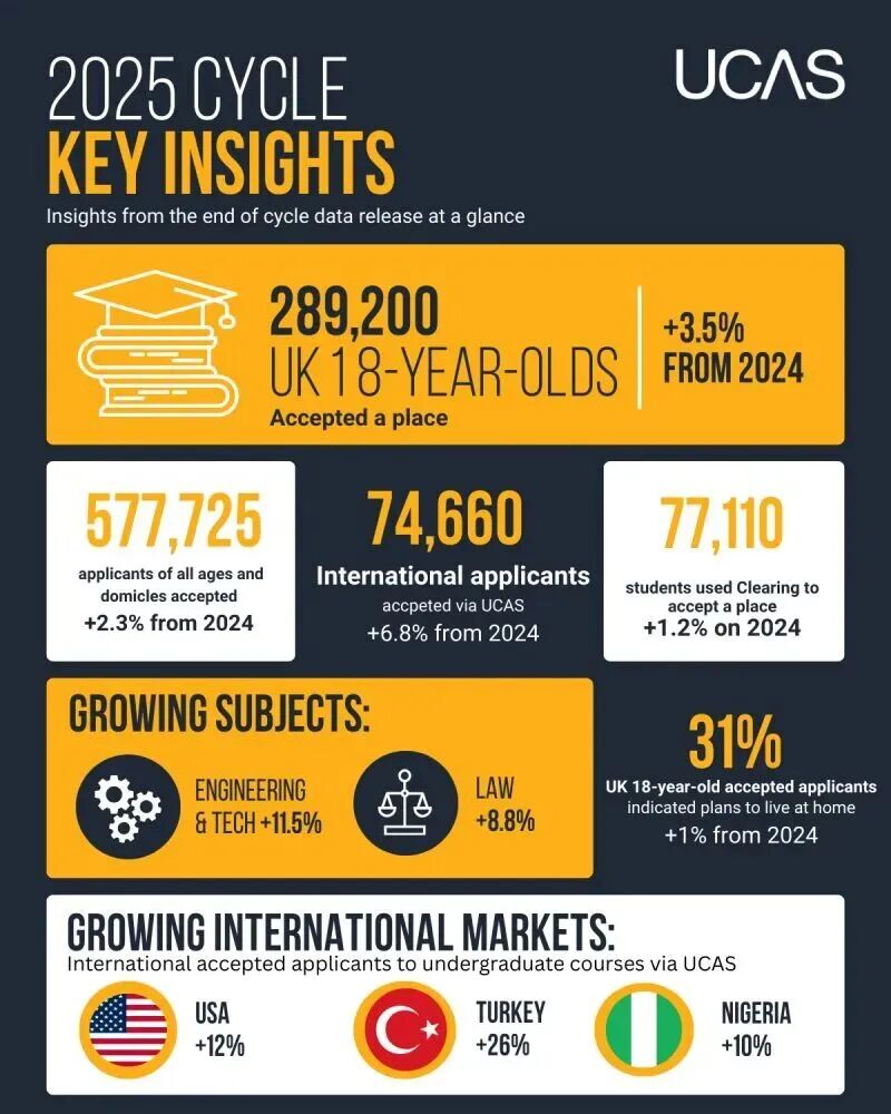 从整体申请趋势到细分学科涨落,2025年的数据清晰地勾勒出英国本科留学的竞争新版图。无论是国际录取机会的扩大,还是补录环节的灵活运用,都提醒着申请者:在稳守传统优势领域的同时,更需敏锐关注新兴增长点。精 准定位、提早规划,方能在持续升温的申请浪潮中,把握属于自己的升学机遇。