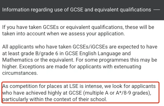 LSE是G5中对GCSE成绩要求最明确、最看重的院校。其每个专业页面都会清晰标注GCSE要求,普遍远高于基础线。大学直接表明:由于竞争激烈,他们寻找的是在多门GCSE科目中取得A/A*(7-9分)的申请者。英语和数学成绩B/6只是最 低门槛,实际录取者的成绩远高于此。可以说,GCSE成绩是LSE筛选的第 一道重要关卡。