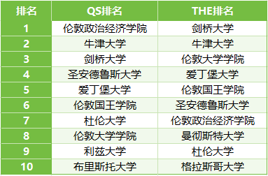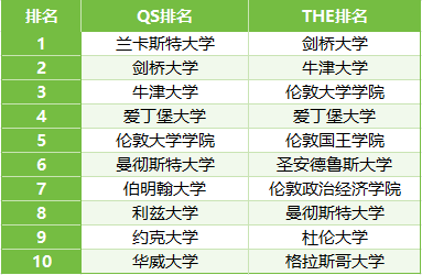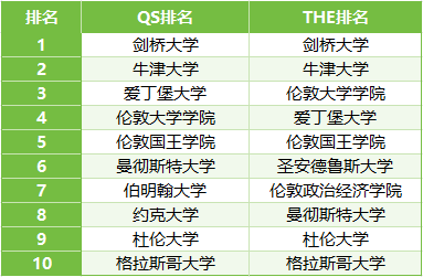 分别在两大排名的“英语”科目中,位列前10的英国大学有
