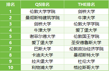 分别在两大排名的“建筑学”科目中,位列前10的英国大学有