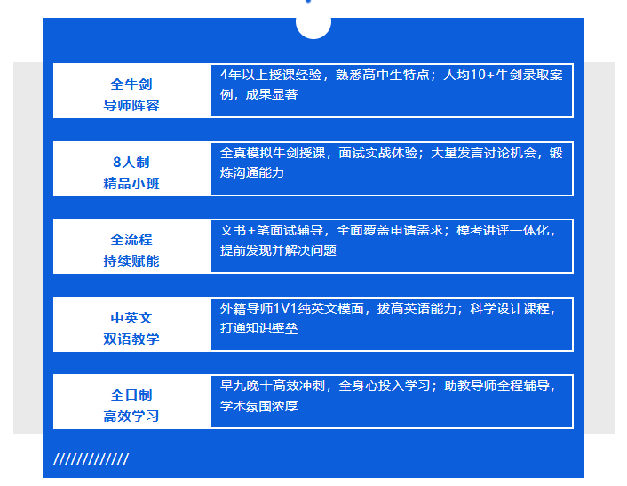 前程锦秋牛剑营是由全牛剑背景导师团队领衔,专为冲刺牛剑G5及中国香港、新加坡等世界顶 尖大学的申请者量身打造的14天高强度集训营。