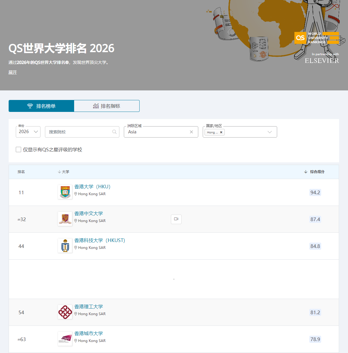 在2026年QS世界大学排名中,中国香港和新加坡的高校表现各具特色。