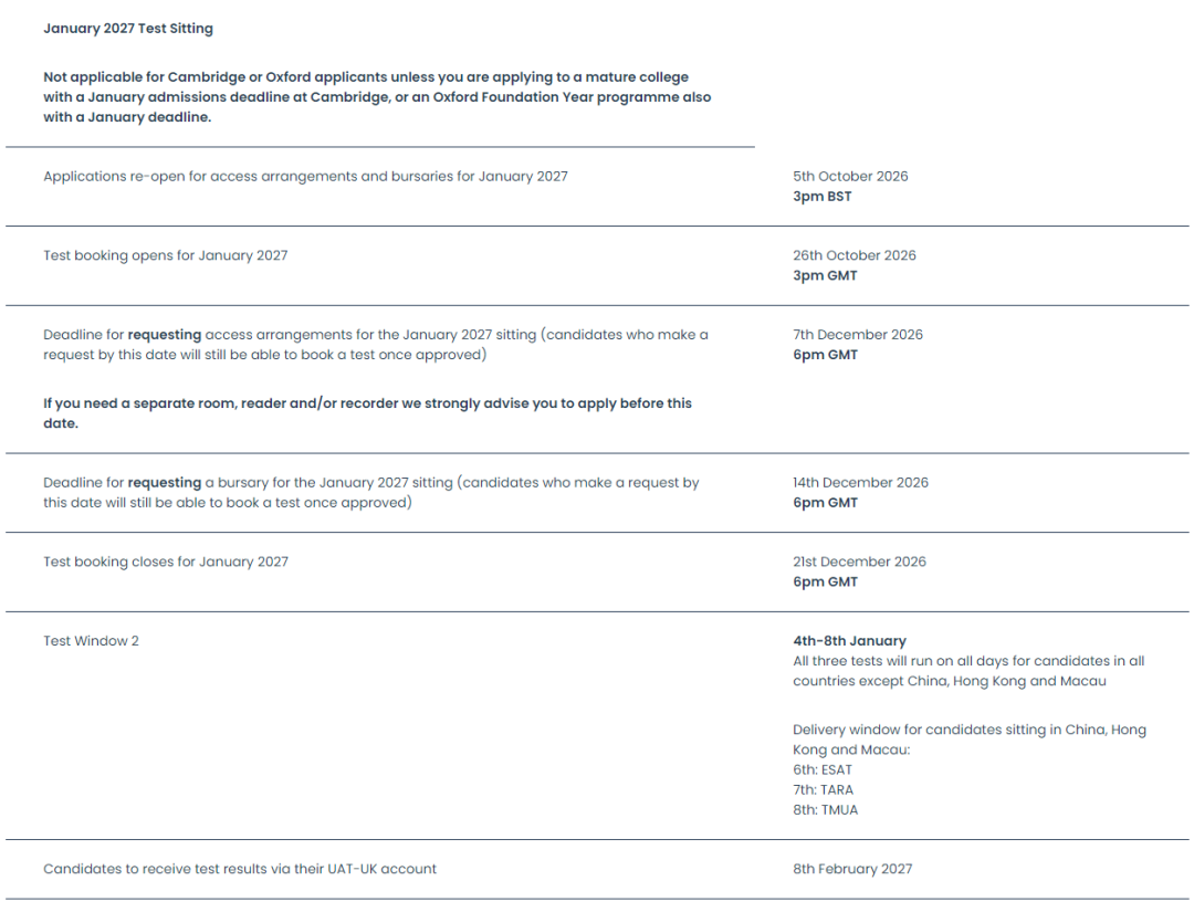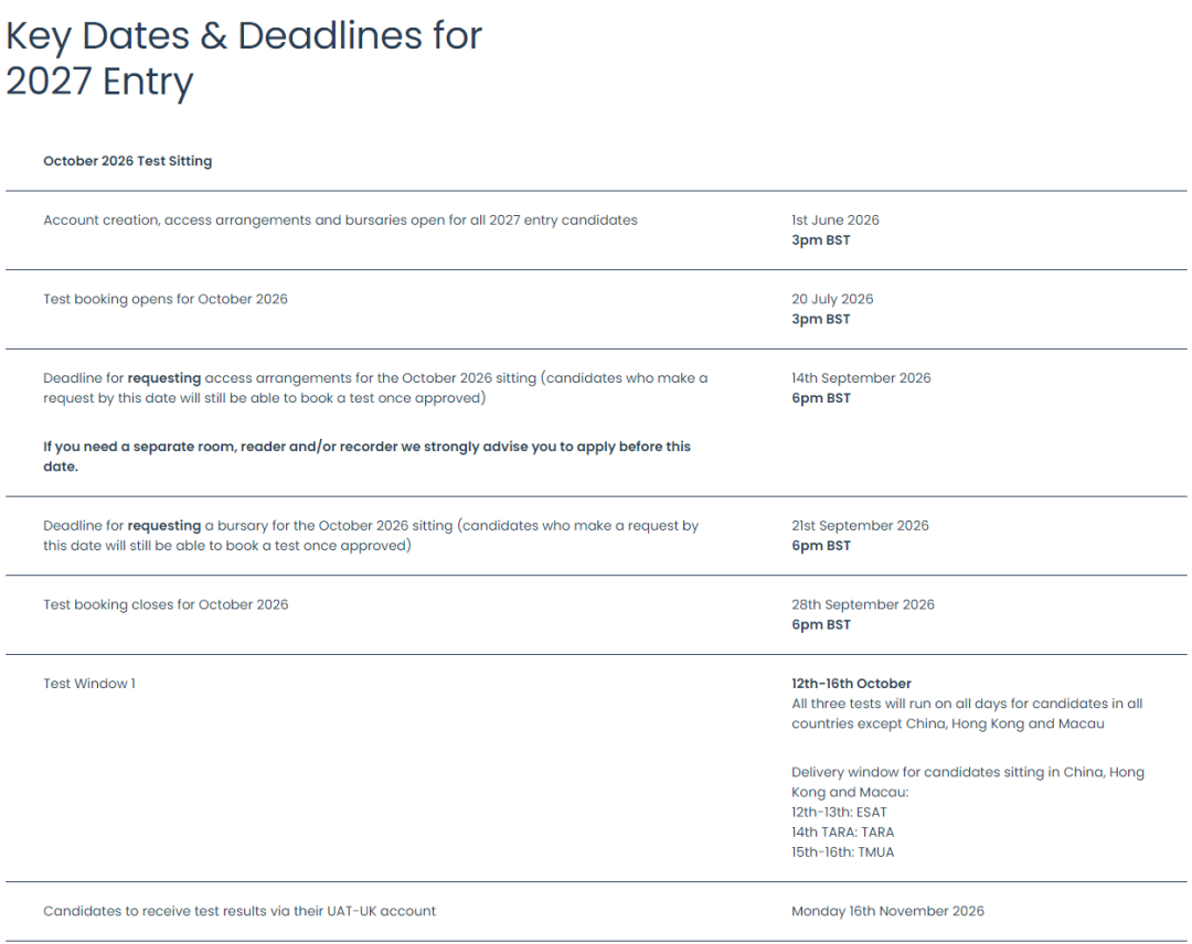 千呼万唤始出来!4月第 一天刚过,UAT-UK就准时放出了2027入学季TMUA、ESAT、TARA三大笔试的时间安排。看完只想说:变化太大了!报名时间提前了十几天,每轮考试日从去年的2天扩容到整整5天可选。更惊喜的是,中国区考生也跟着“福利升级”——去年只能选第二天,今年第 一轮直接解锁2天可选。今天就把这份时间表拆解清楚,帮你提前锁定考位、不错过任何一个关键节点。