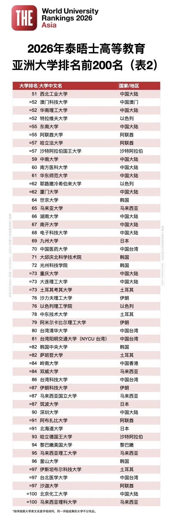 随着亚洲留学热度持续攀升,亚洲大学排名已成为众多家庭选校的重要参考。刚刚,泰晤士高等教育(THE)正式发布2026年度亚洲大学排名!这是第14版,来自36个国家/地区的929所高校上榜,规模再创新高。中国大陆高校强势领跑:清华大学连续八年蝉联亚洲第 一,北京大学稳居第二,复旦大学、浙江大学、上海交通大学均跻身前十。新加坡双雄稳坐前五,中国香港八所大学全部上榜。想了解亚洲顶 尖名 校格局?先来一睹TOP50院校风采!