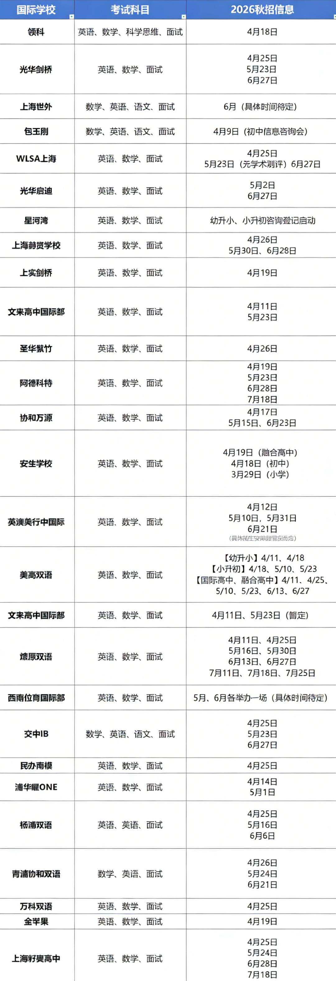 上海国际高中4月秋招考试汇总|领科/光剑/WLSA/上实剑桥时间表,速收藏!