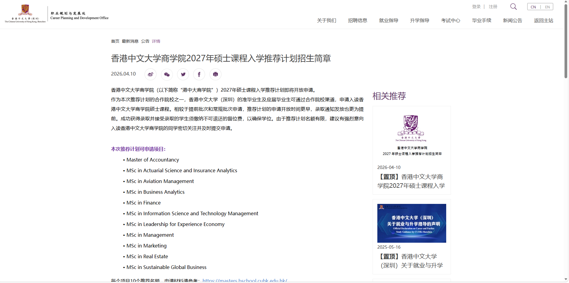香港中文大学商学院2027年硕士课程入学推荐计划招生简章