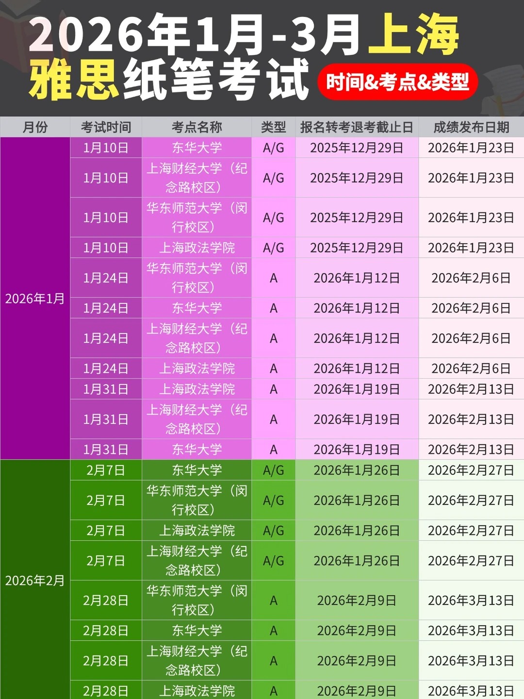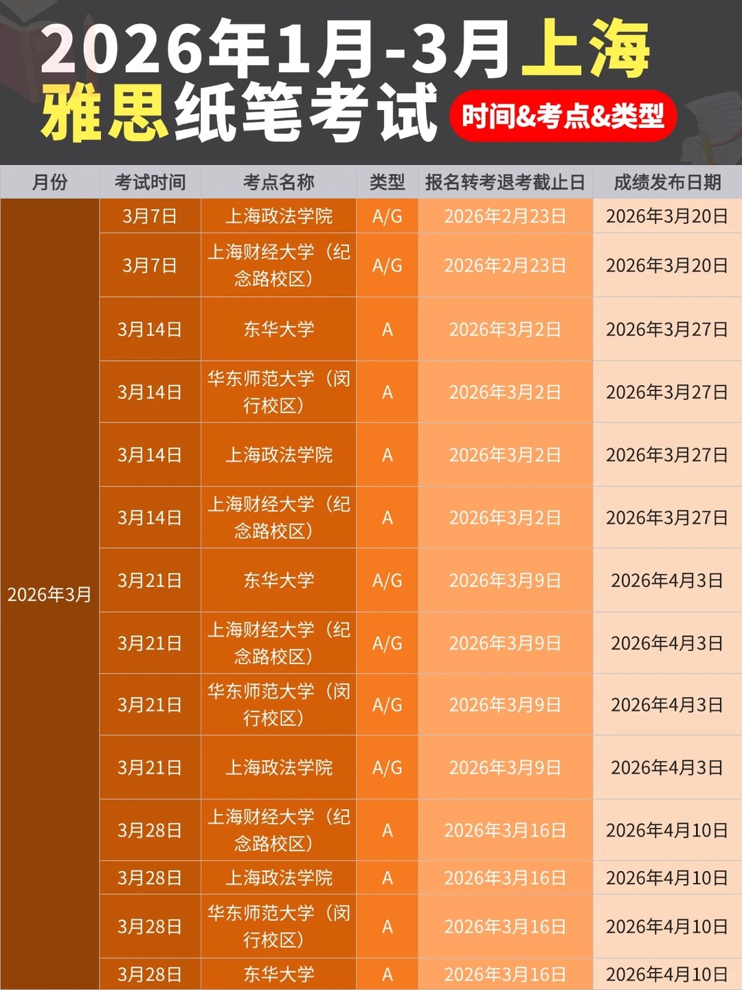 备考上海地区的雅思考生迎来利好 消息!随着2026年首季度雅思纸笔考试日程正式公布,本季度共安排了9场A类考试,覆盖上海财经大学、上海政法学院等四大考点,为考生提供了灵活的选择空间。尤其值得关注的是,自2026年1月1日起,雅思考试费用将迎来多年未见的调整,为广大考生减轻了部分经济压力。本文将为您详细盘点1月至3月的关键考试日期、各考点具体信息及交通指南,帮助您高效规划报名与赴考行程,把握最 佳考试时机。