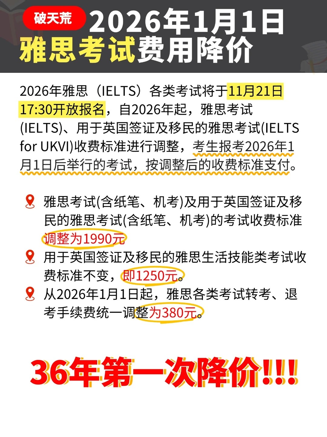 雅思考试(含纸笔、机考)&英国签证及移民雅思(含纸笔、机考)统一下调至1990元!