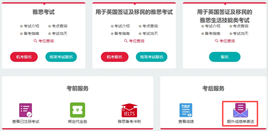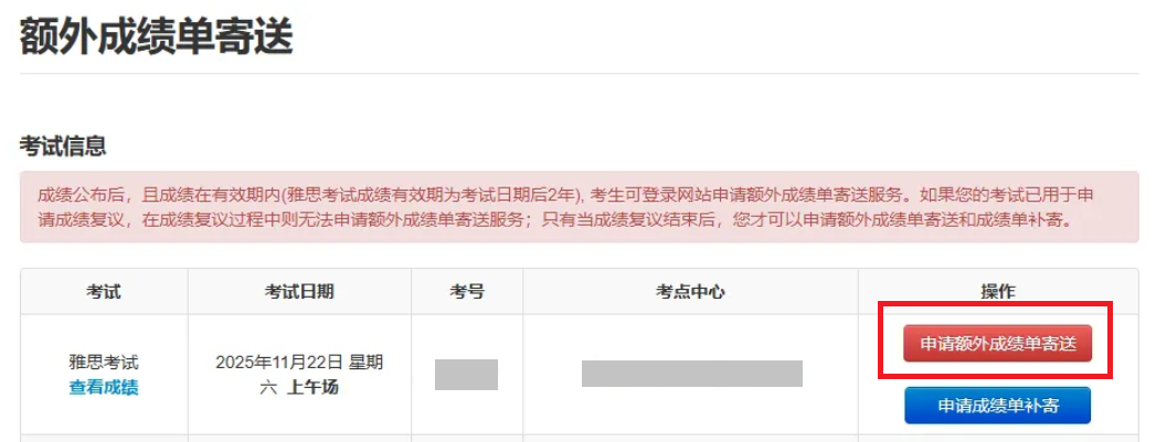 在个人主页底部找到“额外成绩单寄送”按钮,点击进入送分申请页面。找到对应考试后,点击“申请额外成绩单寄送”。