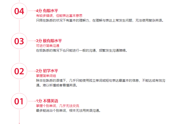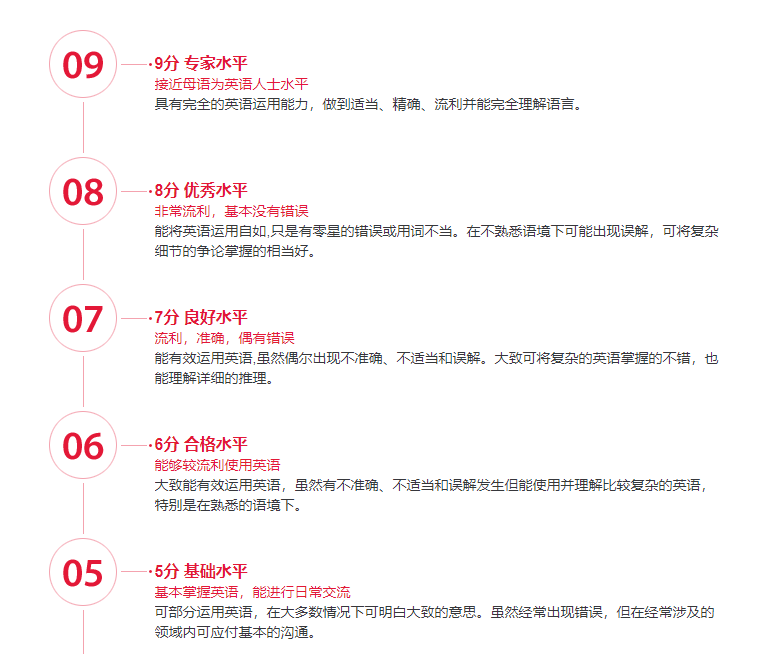 我们来看官方标准定义,雅思考试的九个分数段及所对应的语言能力描述如下: