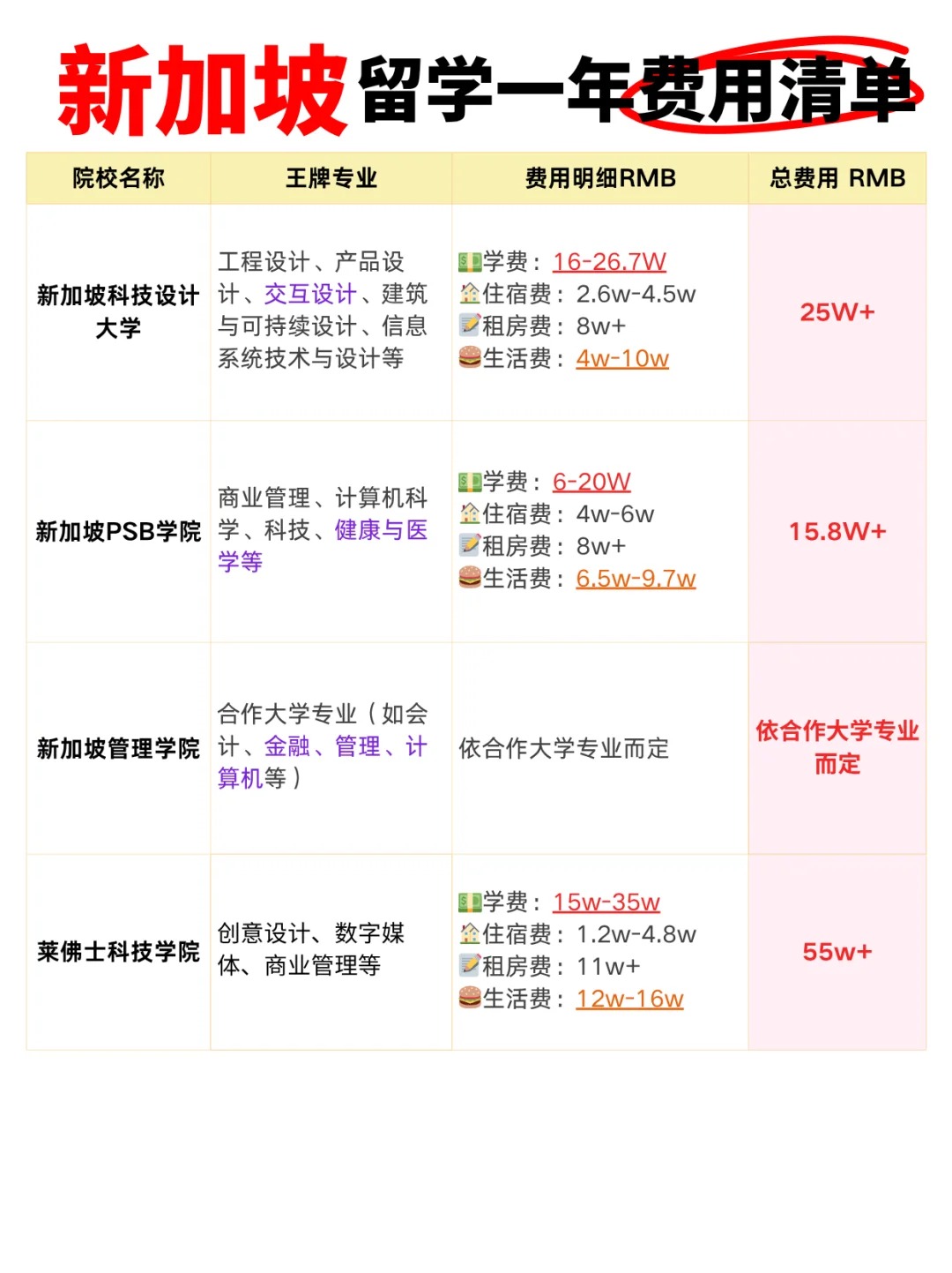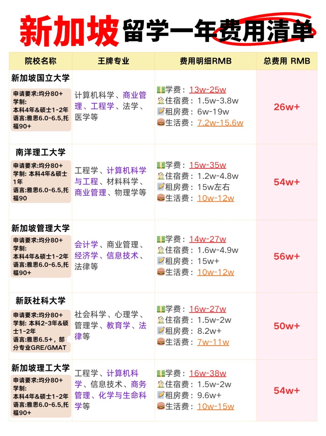 硕士学费范围:15万-40万人民币/年,部分商科课程(如金融、会计)较高,可达60万新元/年(约320万元人民币)。