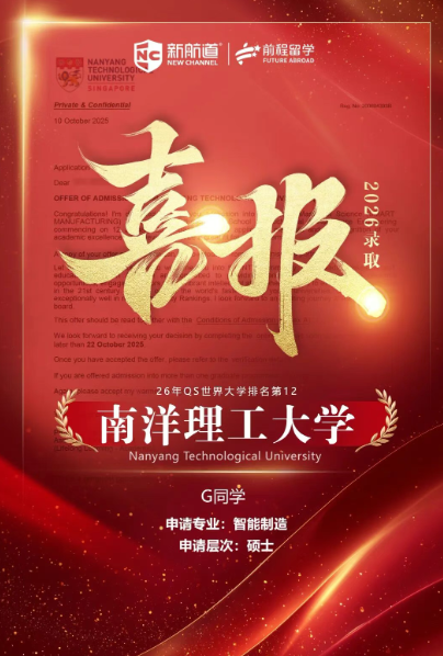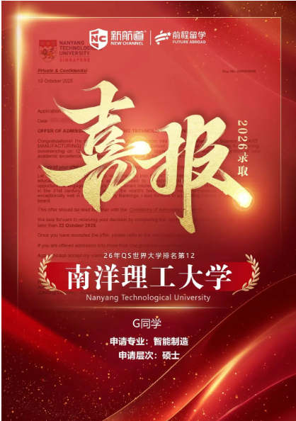 截至目前新航道前程留学学子也已斩获45枚南洋理工26fall硕士offer啦~更多好录取还在路上!