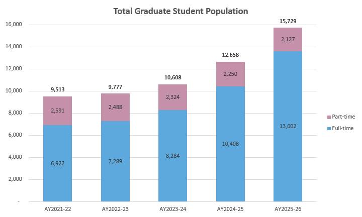其实扩招不只发生在今年。最近,NTU公布了2025-2026学年入学数据,全日制研究生规模达13,602人,同比增长31%;研究生总数更创下15,729人的新高,近五年累计增幅达65%。