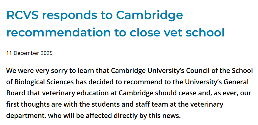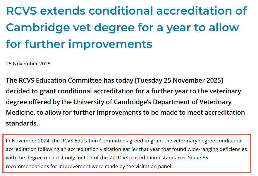 尽管剑桥兽医学院随后启动紧急整改,目前达标项目已提升至 57 项,且 RCVS 已于 2025 年 11 月决定将有条件认证延长一年以支持后续改进,但长期存在的财务亏损问题仍让校方难以承压,最终促使其以 "战略与财务原因" 考量关停该本科专业。