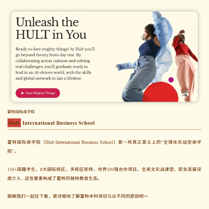 霍特从不标榜自己是“常春藤”,它更在意你毕业时能不能交付结果。当全球校友遍布170国、企业项目贯穿每门课程、职业教练从入学跟到就业,这所商学院定义的“国际化”,早已不是学生构成多元,而是你从第 一堂课起就在国际化的规则里做事。如果你不想把大学过成四年“准备期”,而是直接进入“实战状态”,霍特提供的不是一条标准赛道,而是一张可以随时换乘的全球通票。