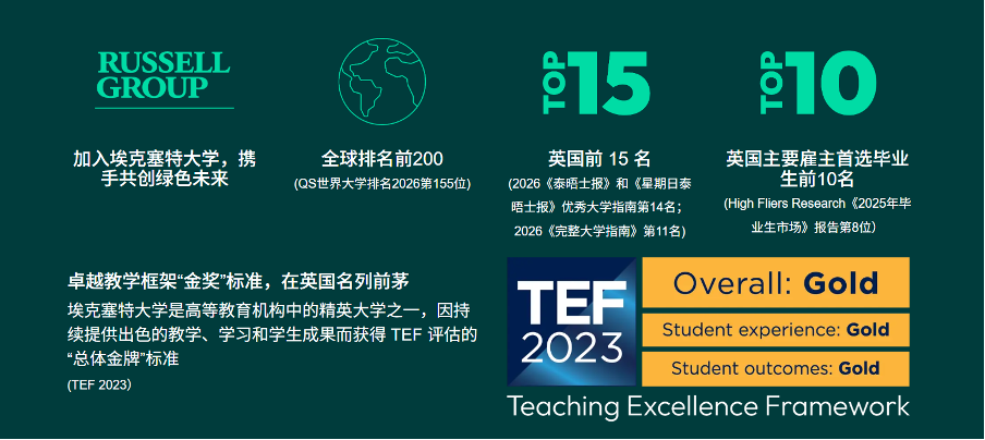 根据2026QS世界大学排名,埃克塞特大学全球位列第155名;在2026年泰晤士报和完全大学指南的英国大学排名中,均位列全英高校前15名,是获得英国权威卓越教学框架(TEF)“金 牌”认证的精英大学。