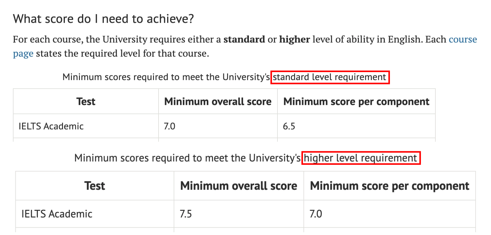 而针对研究生申请的雅思要求调整为Standard和Higher两个档: