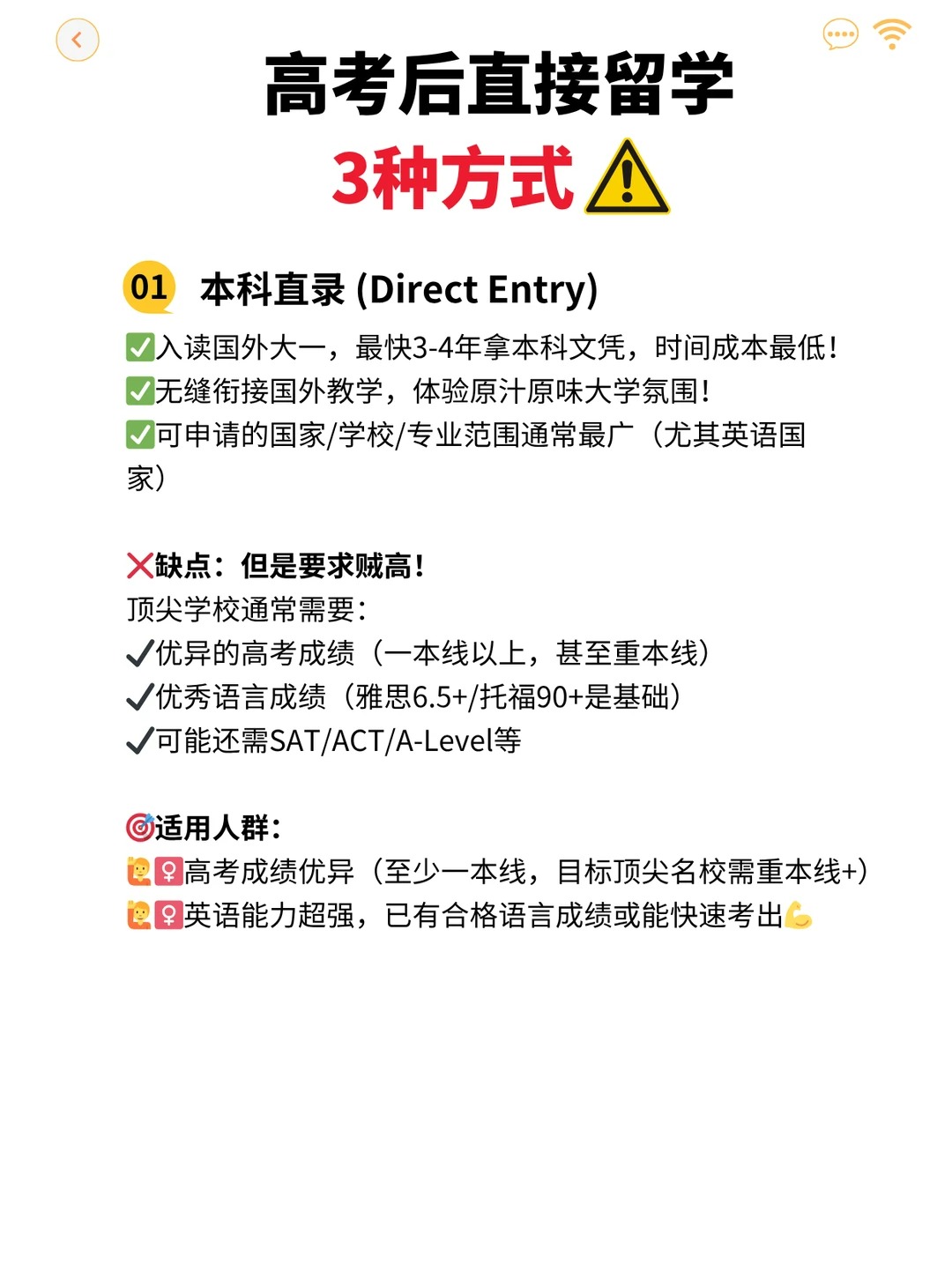 1、本科直录 (Direct Entry) :直接入读国外大一,最快3-4年拿本科文凭,时间成本最 低! 无缝衔接国外教学,体验原汁原味大学氛围。 可申请的国家/学校/专业范围通常最广(尤其英语国家)。适用人群: 高考成绩优异(至少一本线以上,目标顶 尖名 校需重本线+) 英语能力超强,已有合格语言成绩或能快速考出。 缺点:但是要求贼高!顶 尖学校通常需要优异的高考成绩(一本线以上,甚至重本线)、优 秀语言成绩(雅思6.5+/托福90+是基础)、可能还需SAT/ACT/A-Level等。