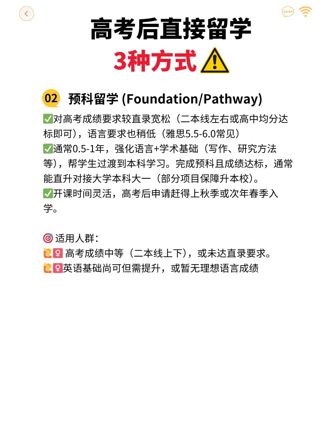 2、 预科留学 (Foundation/Pathway) :对高考成绩要求较直录宽松(二本线左右或高中均分达标即可),语言要求也稍低(雅思5.5-6.0常见)。通常0.5-1年,强化语言+学术基础(写作、研究方法等),帮学生过渡到本科学习。完成预科且成绩达标,通常能直升对接大学本科大一(部分项目保障升本校)。 开课时间灵活,高考后申请赶得上秋季或次年春季入学。 适用人群:高考成绩中等(二本线上下),或未达直录要求。英语基础尚可但需提升,或暂无理想语言成绩。