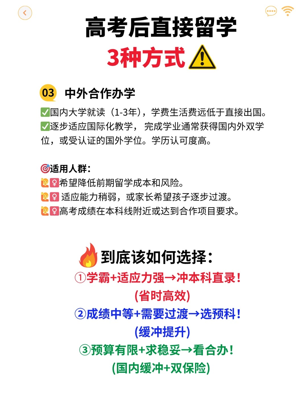 3、中外合作办学 :国内大学就读(1-3年),学费生活费远低于直接出国。 逐步适应国际化教学, 完成学业通常获得国内外双学位,或受认证的国外学位。学历认可度高。适用人群:希望降低前期留学成本和风险。适应能力稍弱,或家长希望孩子逐步过渡。高考成绩在本科线附近或达到合作项目要求。