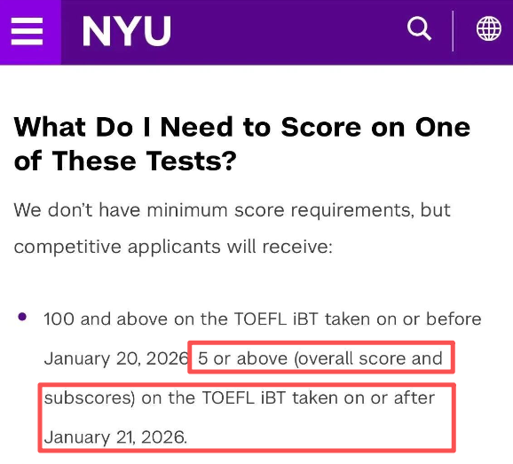 2026年1月21日后参加考试:新托福需达到5分;各单项不低于4分。大学将据此审核各科目领域语言能力的均衡性。