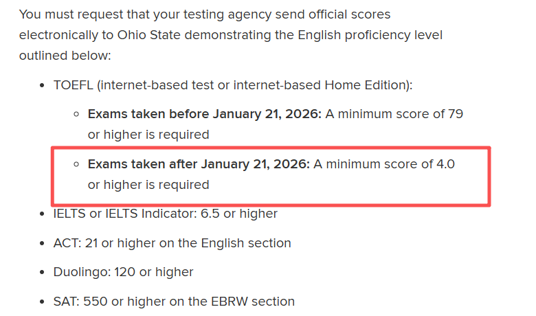 2026年1月或之后 参加的托福考试,要求最 低分数为5.0分,建议达到5.5分。