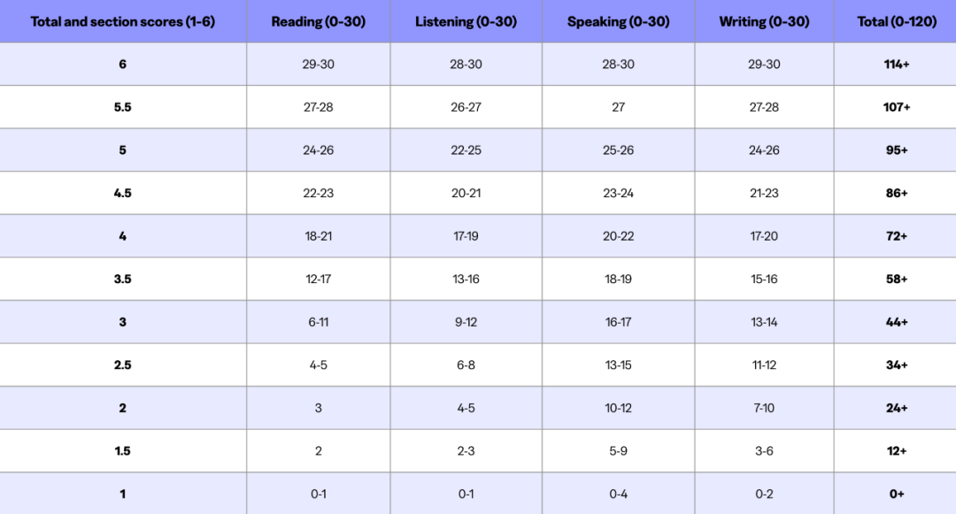 ✅老托福:总分0-120分(阅读、听力、口语、写作各0-30分)