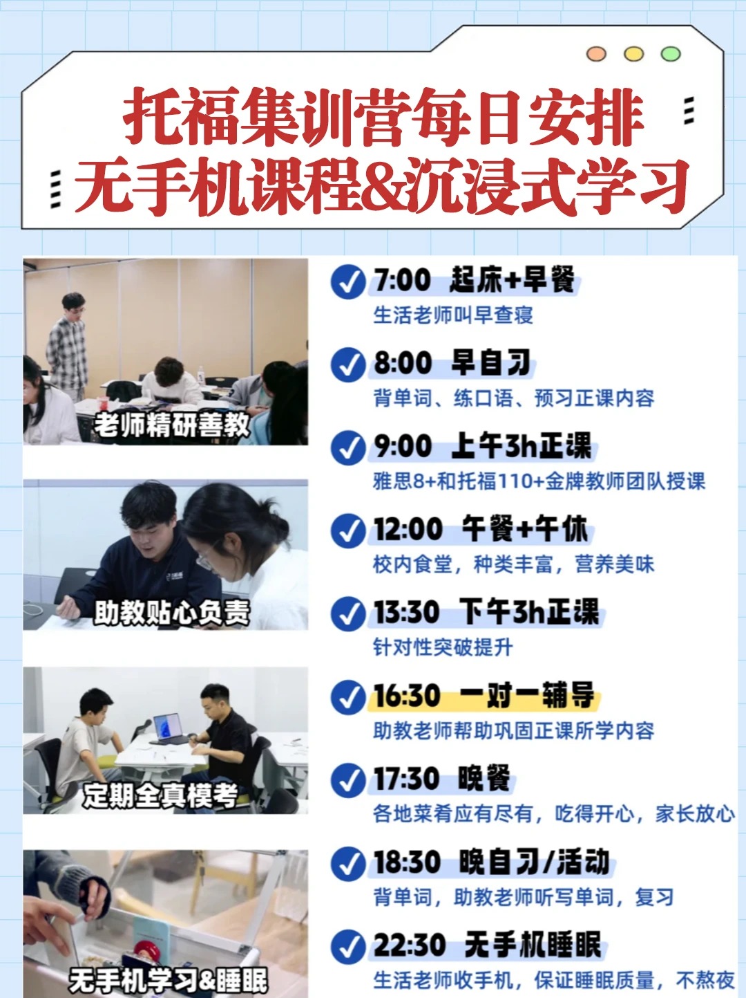 提分逻辑:通过封闭环境下的「输入+输出」循环(上午词汇语法+下午题型技巧+晚间模考复盘),快速搭建考试思维。