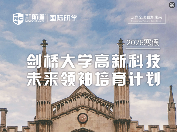 摘要:上海新航道2026年寒假研学营来了:剑桥大学高新科技 未来领 袖培育计划,针对16岁及以上小朋友,招生已开启!详情咨询在线客服!