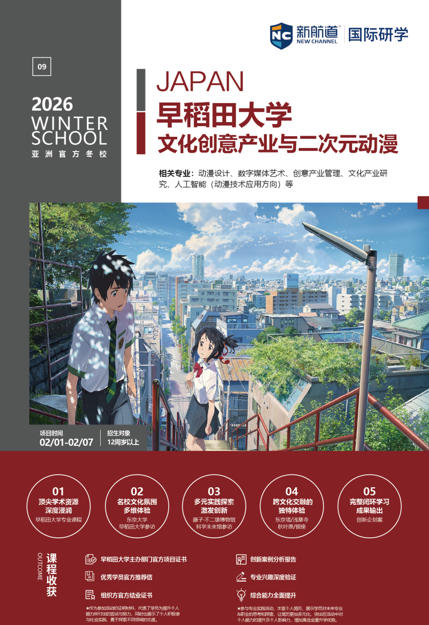 摘要:上海新航道2026年寒假研学营来了:早稻田大学文化创意产业与二次元动漫,针对12周岁以上小朋友,招生已开启!详情咨询在线客服!