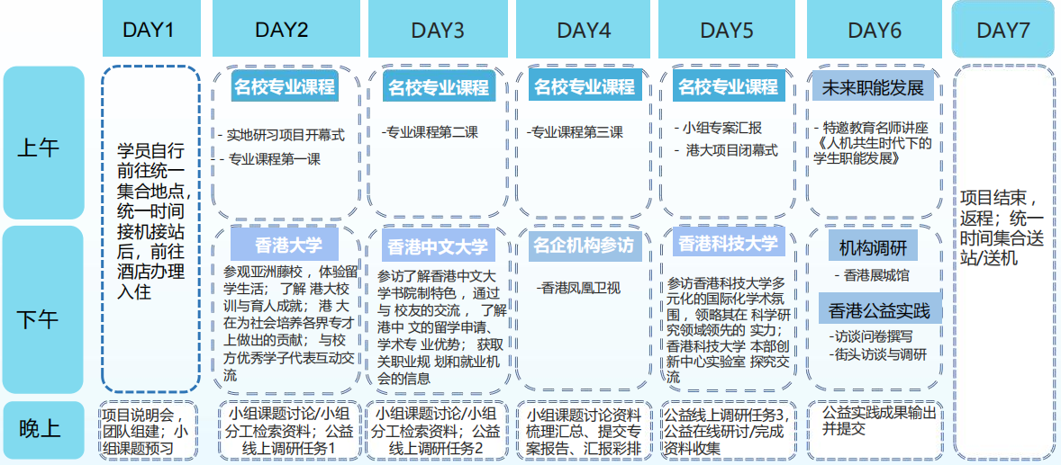 探访世界名 校,感受浓厚学术氛围;与名 校优 秀学子互动交流,感受榜样的力量,了解香港教育体制与名 校人才培育成果;拓展国际视野,激发创新意识和创造力。